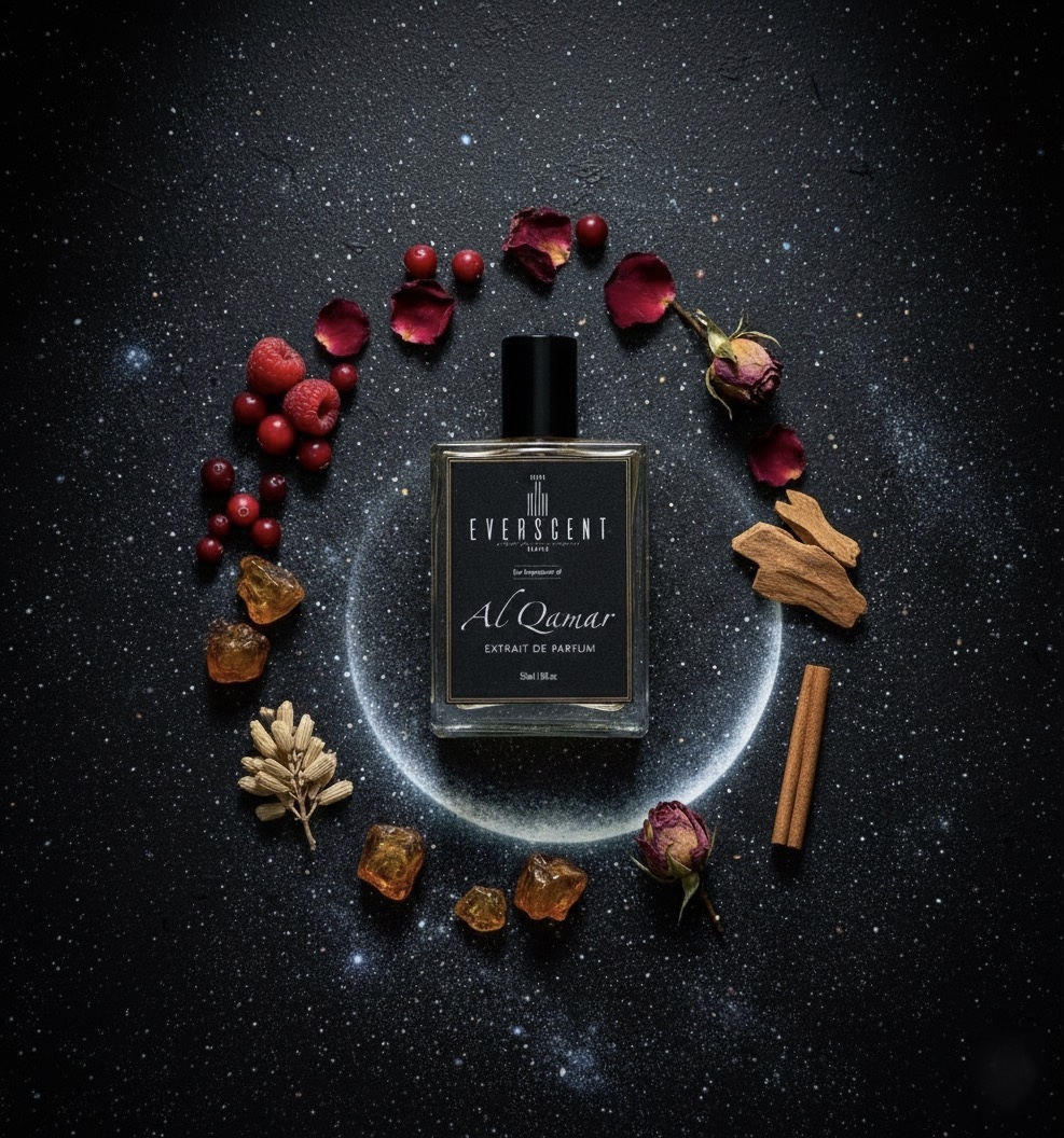 A luxurious fusion of berries, rose, and oud — sweet, smoky, and unforgettable. Al Qamar, the scent of power wrapped in allure.