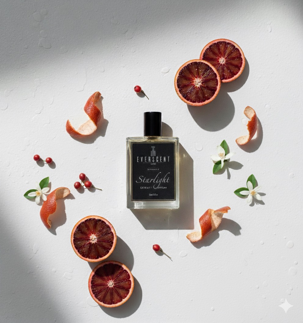 StarLight opens with a dazzling blend of lime, blood orange, and bergamot — a lively citrus symphony that instantly uplifts. The heart reveals delicate tiare flower, adding a velvety floral warmth that softens the edges of the vibrant top. As it settles, powdery musk and creamy sandalwood create a smooth, luminous trail — airy yet sensual, like a warm breeze under a star-filled sky.